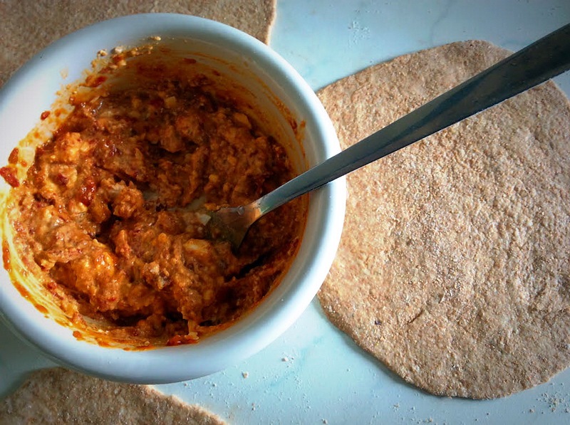 Napravite male loptice između dlanova, a onda ih razvaljate oklagijom. Pomešate fetu i ajvar i filujete.
