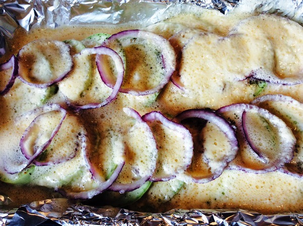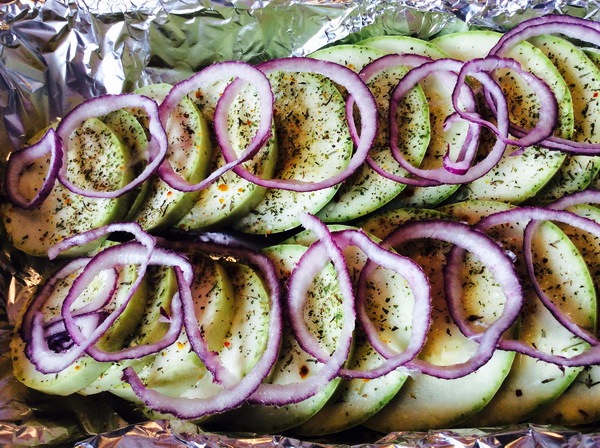 Pleh obložite folijom. Isecite tikvice na kolutove i poređajte ih u pleh, preko njih stavite kolutove crvenog luka, pa onda sve začinite.
