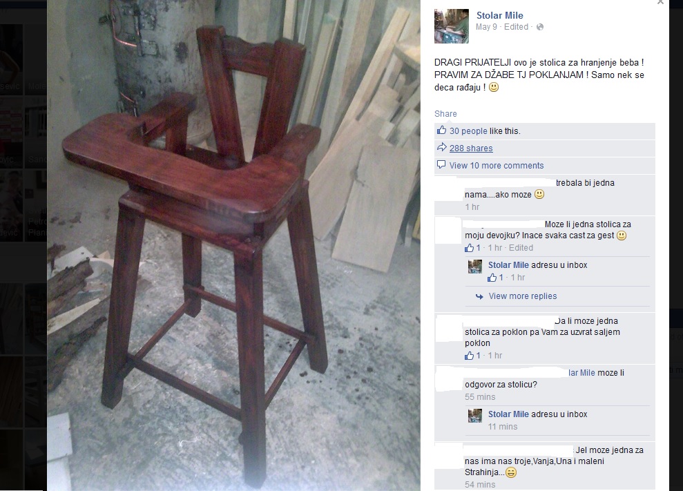 Oskudica, manjak posla, plate koje kasne…, sve to uliva strah mladim ljudima da se odvaže na proširenje porodice. Stolar Mile iz Beočina kod Novog Sada odlučio je da ih podstakne i podrži na svoj način - preko Fejsbuka je obelodanio da pravi i poklanja stolice za bebe!