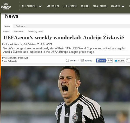 On je najmlađi igrač u istoriji koji je ikada zaigrao za reprezentaciju Srbije, počela je UEFA tekst na svom sajtu posvećen "vunderkindu" Partizana, Andriji Živkoviću.